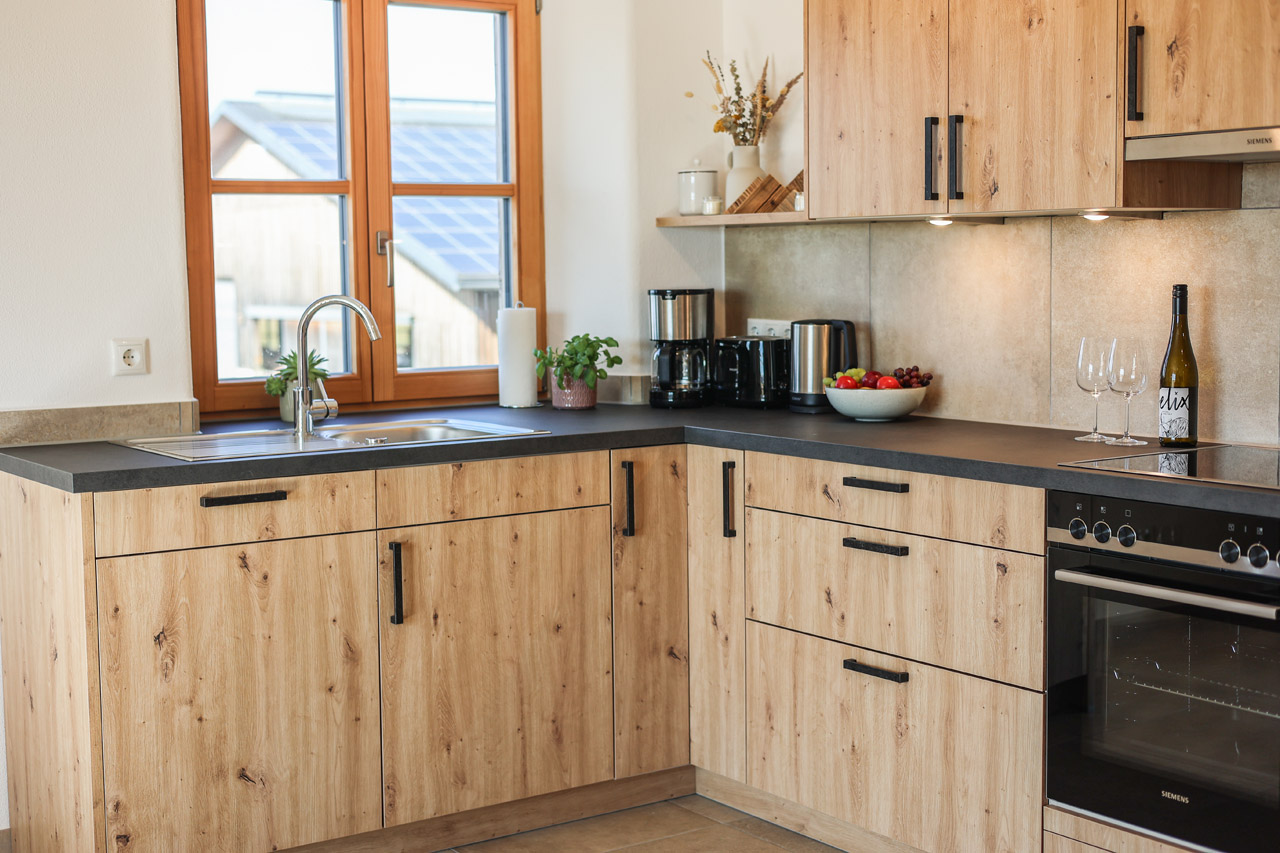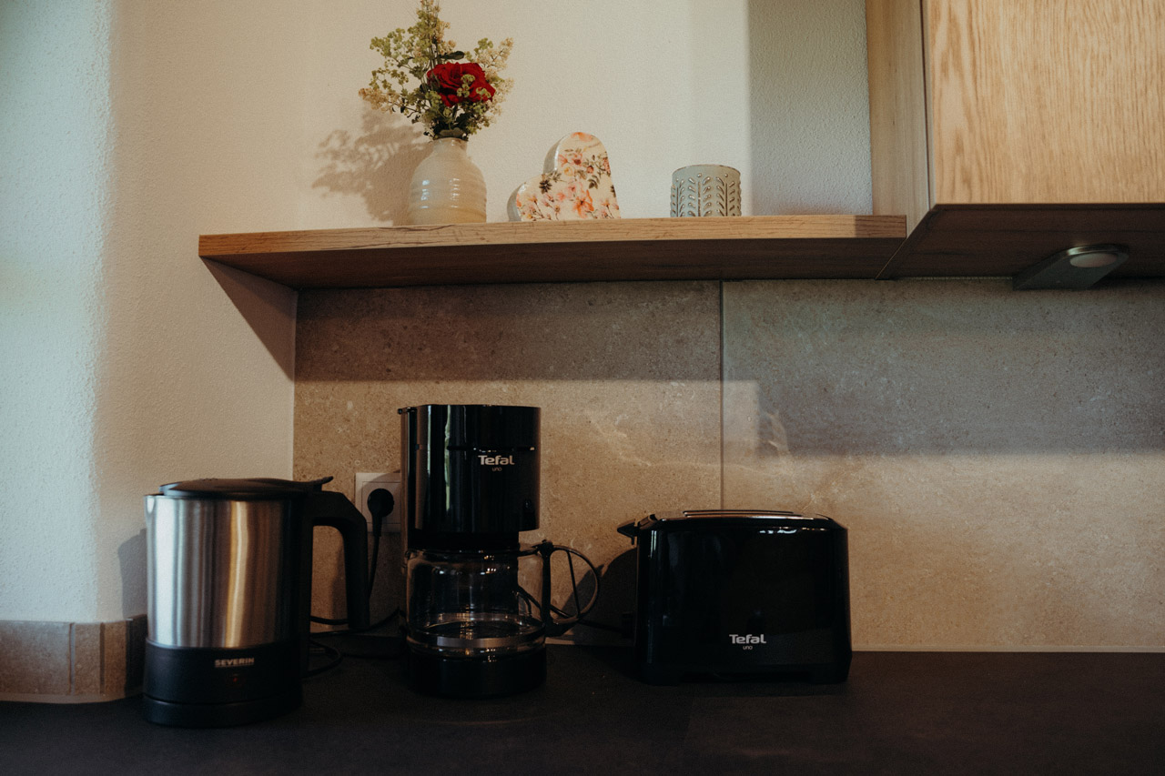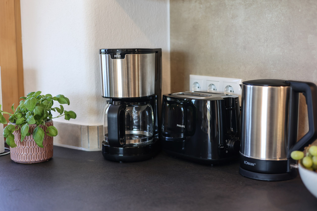 - Wohnküche: Kühlschrank mit Gefrierfach, Backofen, Herdplatte mit Ceranfeld, Spülmaschine, Wasserkocher, Kaffeemaschine, Toaster