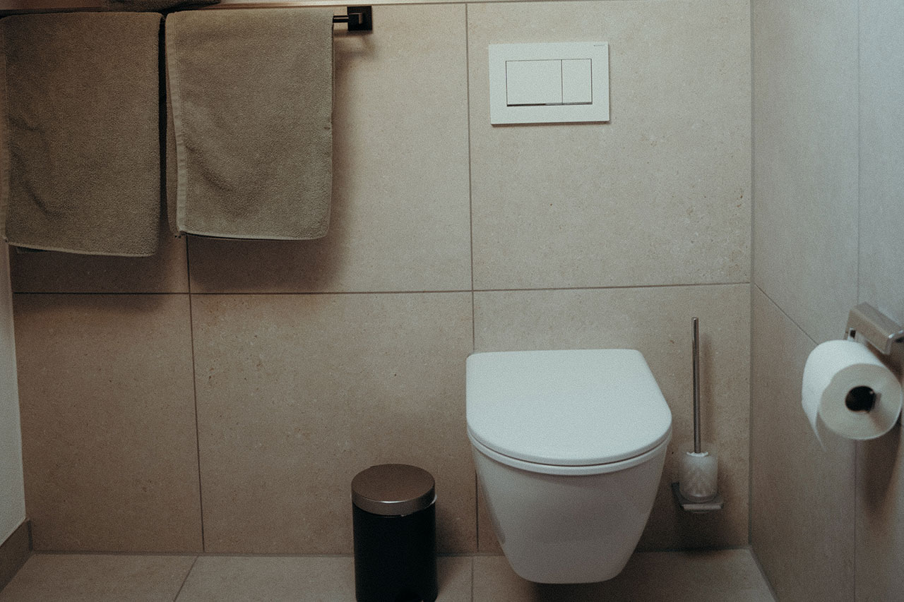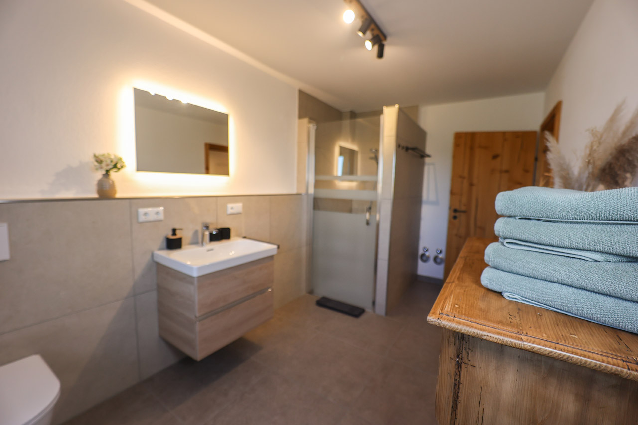 - Badezimmer mit großzügiger Dusche, Toilette und Haartrockner